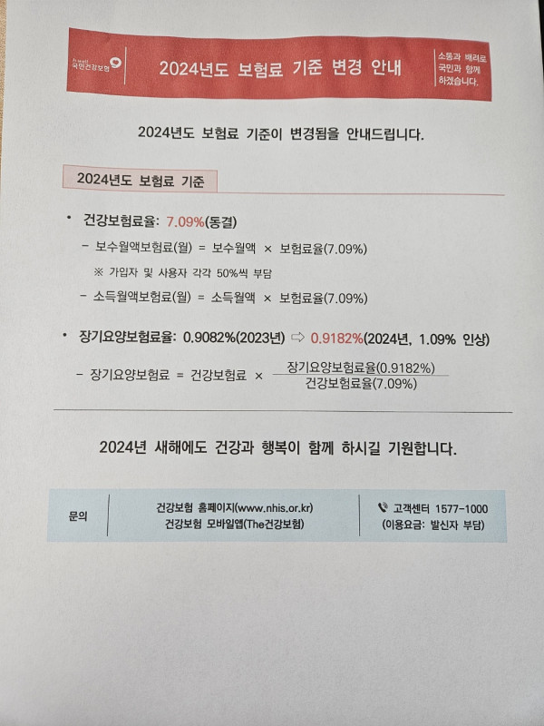 2024년도 보험료 기준이 변경됨을 안내드립니다 페이지 정보 작성자 최고관리자 작성일24-03-27 11:05 조회982회 댓글0건 관련링크 이전글 다음글 목록 본문 댓글목록 등록된 댓글이 없습니다. 이전글 다음글 목록